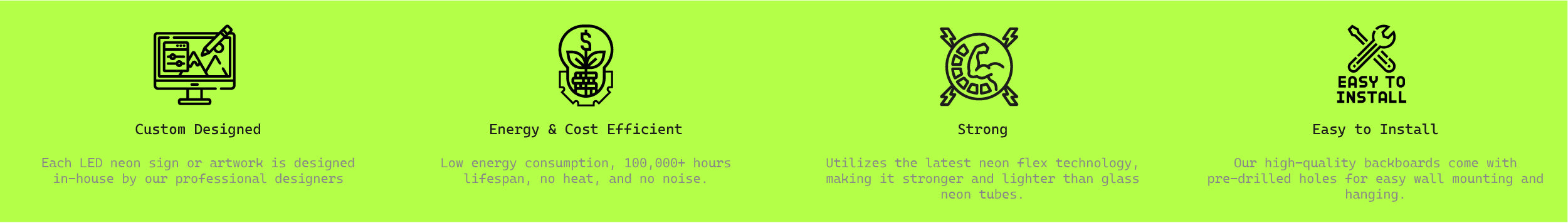 Our products are made with flex LED neon, making them safe, lightweight, easy to install, and maintenance-free. We offer free consultation to help you choose the perfect design, and we can create signs entirely from scratch based on your logo or idea.